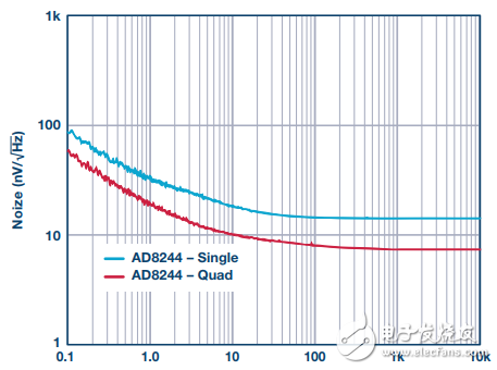 图2. 新型缓冲器AD8244的性能:噪声仅为普通缓冲器的一半