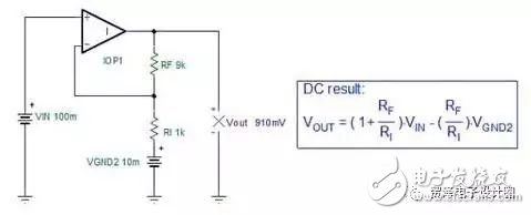 我们以以下所示标准非反相放大器电路为例加以说明。在输入电源 VIN 和输入电阻器 RI的 GND 电势相等时,适用于我们熟悉的电路增益 1+RF/RI。因此,100mV 输入信号乘以 10V/V 增益,就等于 1V 的输出。