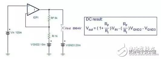 在以下所示电路中,当输出电压参考第三个 GND 电势 VGND3 时,传输函数会进一步受到影响。VGND3 电压将直接从前一个输出传输函数中减去。所以与所需的 1V 输出相比,20mV VGND3 电压可将输出电压降至 890mV,相当于 11% 的误差。