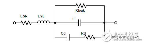 实际电容的特性都是非理想的,有一些寄生效应;因此,需要用一个较为复杂的模型来表示实际电容,常用的等效模型如下: