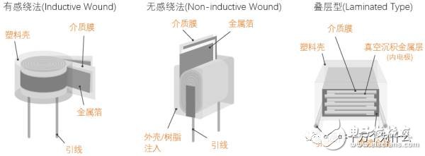 薄膜电容有两种卷绕方法:有感绕法在卷绕前,引线就已经和内部电极连在一起;无感绕法在绕制后,会采用镀金等工艺,将两个端面的内部电极连成一个面,这样可以获得较小的ESL,应该高频性能较高;此外,还有一种叠层型的无感电容,结构与MLCC类似,性能较好,便于做成SMD封装。