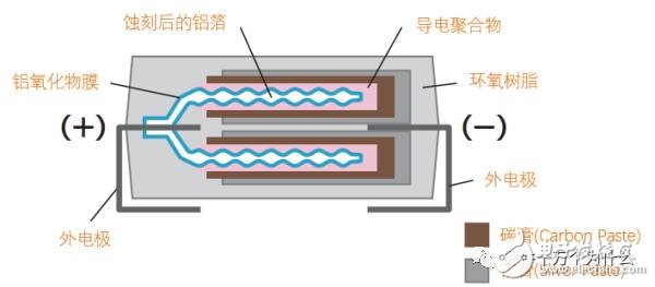 铝电解电容也有使用二氧化锰、导电高分子聚合物等固态材料做电解质;聚合物铝电解电容的结构大致如下图所示: