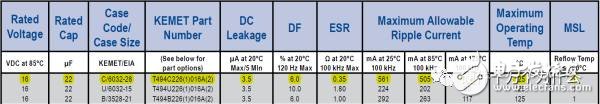 钽属于比较稀有的金属,因此,钽电容会比其他类型的电容要贵一点。但是性能要比铝电解电容要好,ESR更小,损耗更小,去耦效果更好,漏电流小。下图是Kemet一款固态钽电容的参数表: