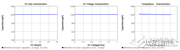 C0G电容的容值十分稳定,基本不随外界条件(频率除外)变化,下图是Murata一款1000pF电容的直流、交流及温度特性。
