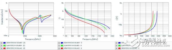 因此,通常只需要关注C0G电容的频率特性。下图是Murata的3款相同封装(0402inch)相同容差(5%)的10pF电容的频率特性对比。