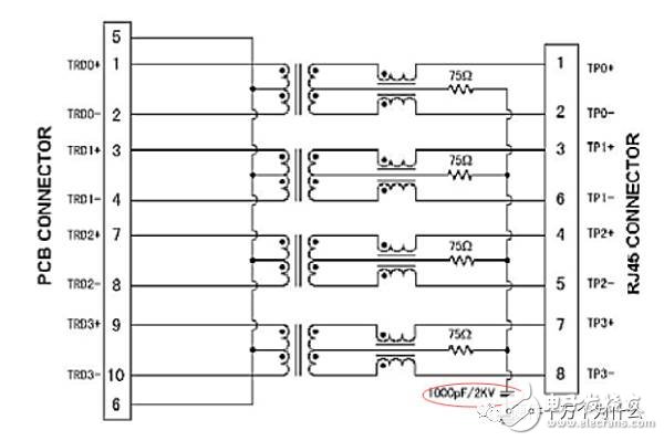 此外,常用的RJ45网口,为了减小EMI,常用到Bob-Smith电路,如下图所示: