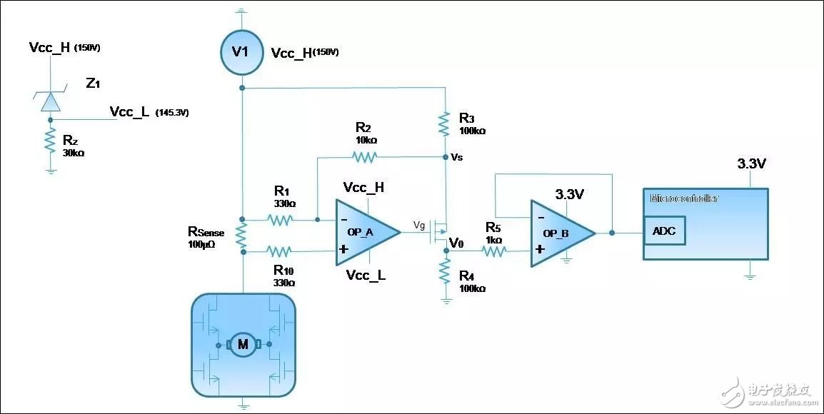 该应用的主要目标是测量一种采用150V电压的工业电机控制的电流;如图1所示,这要归功于分流电阻。为精确测量低电流,使用了5V精密运算放大器。