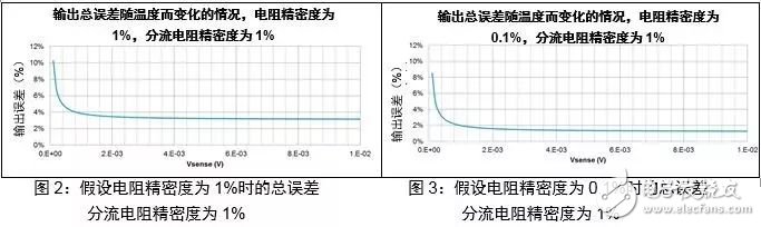 图2和图3中的图表表示预计的最大误差随温度而变化的情况,考虑分流精确度。