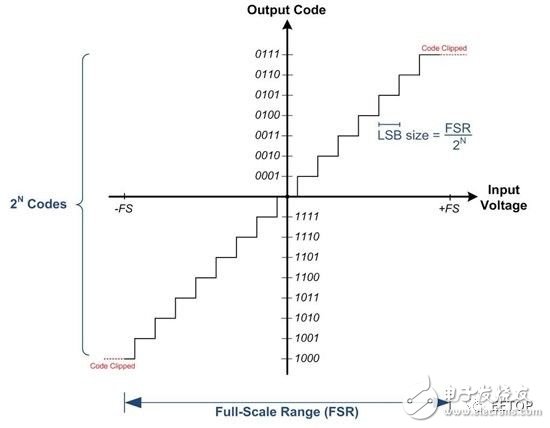 LSB大小等于满量程输入范围(FSR)除以ADC代码的总数。这相当于覆盖整个输入范围所需的每个代码的步长。图1为4位ADC(24= 16个代码)的阶跃函数,它将输入电压映射到输出代码。