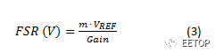 要注意所使用ADC的FSR,因为不同的ADC有不同的FSR。FSR总是与基准电压成正比,也可能取决于任何内部增益,如公式3所示: