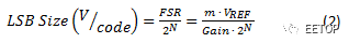 其中FSR是与基准电压成比例的ADC的满量程输入范围(单位为伏特),N是ADC输出代码中的位数。2N等于ADC代码的总数。