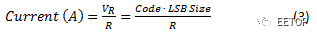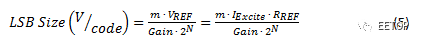 电流源的精度通常会影响电阻测量的精度;但通过使用图2所示的比例配置,您可以消除此依赖关系。注意LSB大小如何与激励电流成比例,如等式5所示: