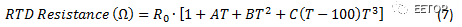 RTD电阻已知,但您仍然必须确定RTD的温度。等式7使用Callendar-Van Dusen方程来指定温度和RTD电阻之间的关系: