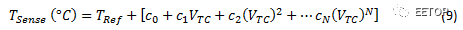 为了确定感应接头处的绝对温度,TSense将相对温度加到参考结温度TRef,必须通过控制其温度或通过其他方法测量温度来获知。一旦ADC测量了输入电压,使用多项式方程计算出热电偶的绝对温度,如公式9所示: