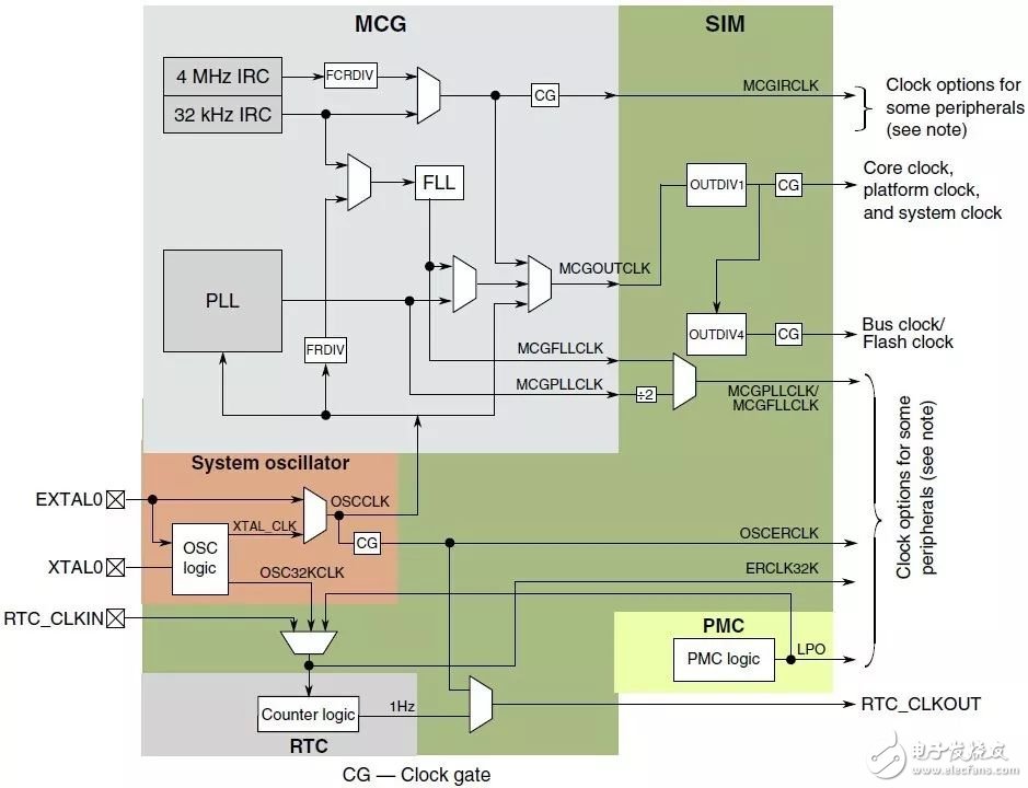 Kinetis系列MCU的时钟系统可以通过内外参考时钟将频率信号源接入到芯片,由多功能时钟发生器MCG为各个功能模块提供所需要的时钟源,利用CG等门控模块启停系统功能模块时钟和时钟分配机制为各功能模块在满足其工作要求的前提下选择相对比较低的模块工作频率,这样既可以做到功能模块的正常工作以及保证功耗为最低。