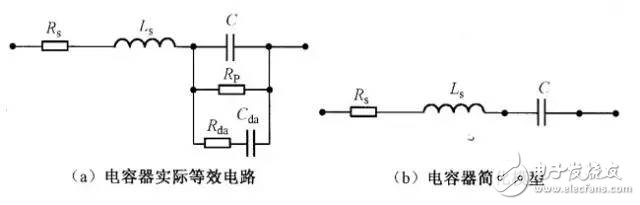 当频率很高时,电容不再被当做集总参数看待,寄生参数的影响不可忽略。寄生参数包括Rs,等效串联电阻(ESR)和Ls等效串联电感(ESL)。