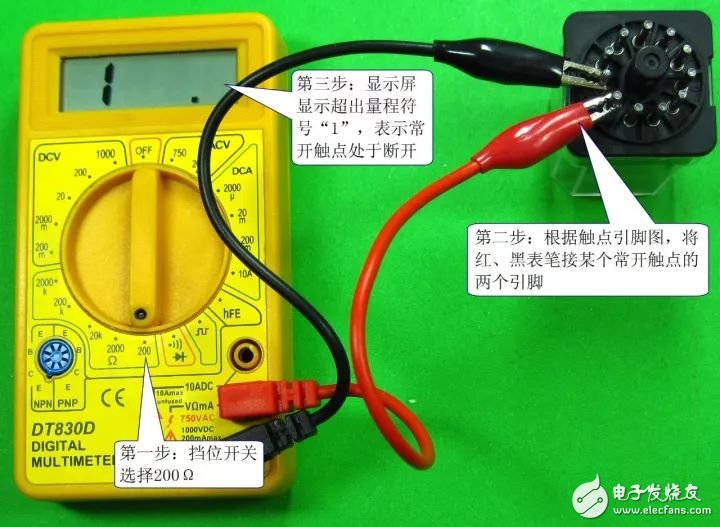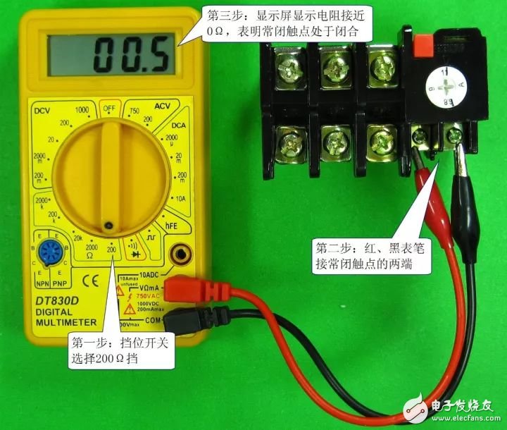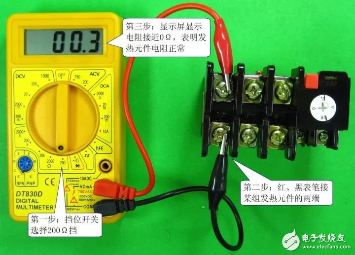 发热元件由电热丝或电热片组成,其电阻很小(接近0Ω)。热继电器的发热元件检测如下图所示,三组发热元件的正常电阻均应接近0Ω,如果电阻无穷大(数字万用表显示超出量程符号“1”或“OL”),则为发热元件开路。