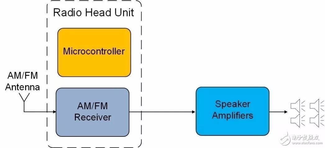 单AM/ FM接收器(入门级系统)。如图4所示,该收音机系统位于中控台的音响主机中,由微控制器控制,将音频发送到放大器。