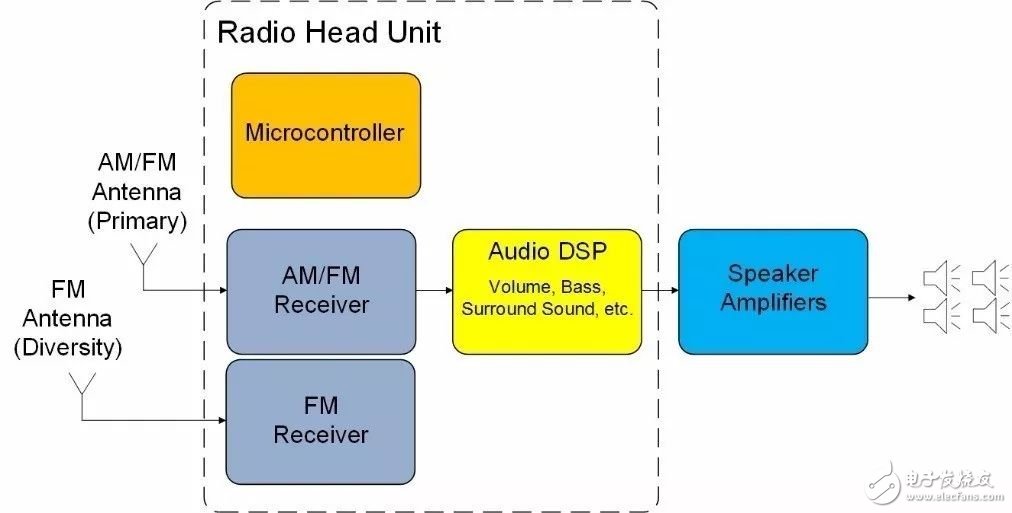 图3:入门级收音机系统位于中控台的音响主机中。AM/FM天线;音响主机;微控制器;AM/FM接收器;扬声器/放大器