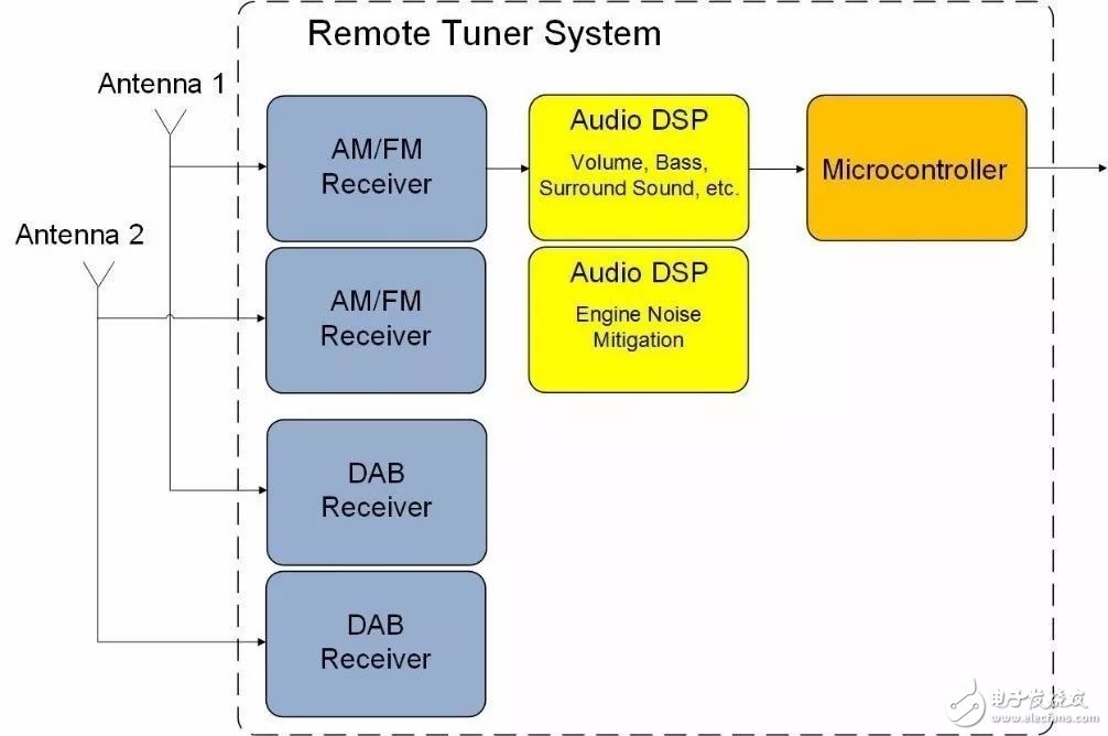 图5:多接收器远程收音机系统位于汽车后备箱或中控台外的另一个位置。天线1;天线2;远程调谐器系统;AM/FM接收器;DAB接收器;音频DSP;音量、重低音、环绕音效等;微控制器;音频DSP;降低引擎噪音
