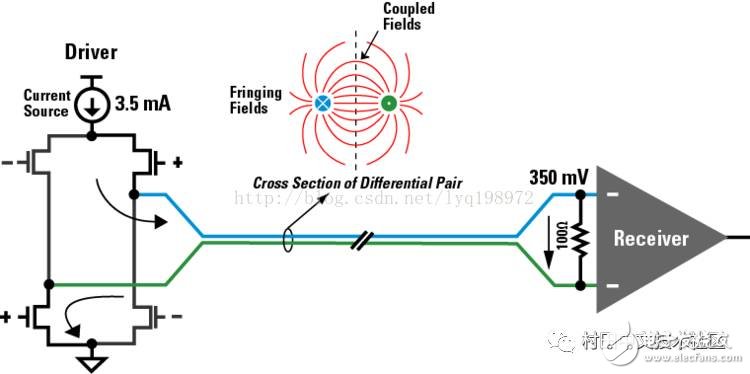 等幅相位相反的两个信号,以一个共模电压为基准做摆动,就叫差分信号。如果一端接地的话就变成单端信号了。如果A,B两个信号的共模电压是1.2V的话(LVDS),那么A,B是在1.2V上做350mV的差模,高低电平是由他们的差值决定的,所以能很好的抑制共模干扰,只要控制两个信号的零点就可以控制信号的逻辑状态了,相比单端的相对于地的阀值电平,具有抗共模干扰能力强,适合电压传输,EMI少的优点。对于差分信号为什么需要共模扼流圈,是因为差分放大器都有一个共模抑制比,超过这个CMRR,就会失真。下图是差分的具体实现图(LVDS):