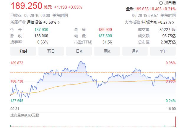 苹果股价创新高;科技巨头苹果股价截至周三收盘升至创纪录高位,苹果市值再一次接近3万亿美元。周三苹果股价收于189.25美元,市值达到2.98万亿美元。