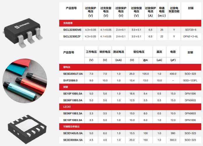 Semiware的电路保护方案提供高紧凑度、低电容、低漏电、超高稳定性的ESD防护器件以及完善的器件组合。封装外形包括SOT23-5、DFN2×2-6L、SOD-323、SOD-123FL、DFN1006、DFN0603等等。