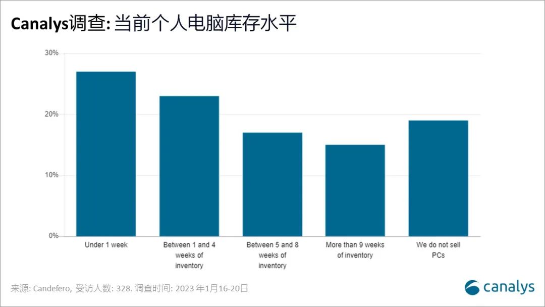 根据头部个人电脑厂商(苹果除外)最近的财务状况,惠普和华硕的库存天数(DoI)已经开始减少,而其余三家厂商(戴尔、联想和宏碁)的库存天数则略有增加。由于所有厂商都已采取积极行动来减少产量,预计 2022 年第四季度和 2023 年第一季度总体的库存天数将会进一步改善,有望在 2023 年第二季度恢复正常库存水平。与此同时,根据我们最近对Candefero社群的民意调查显示,60% 以上合作伙伴的个人电脑库存水平低于四周,而约 20% 的受访者持有超过九周的库存,这表明整体渠道库存水平正在恢复到一个更健康的水平。