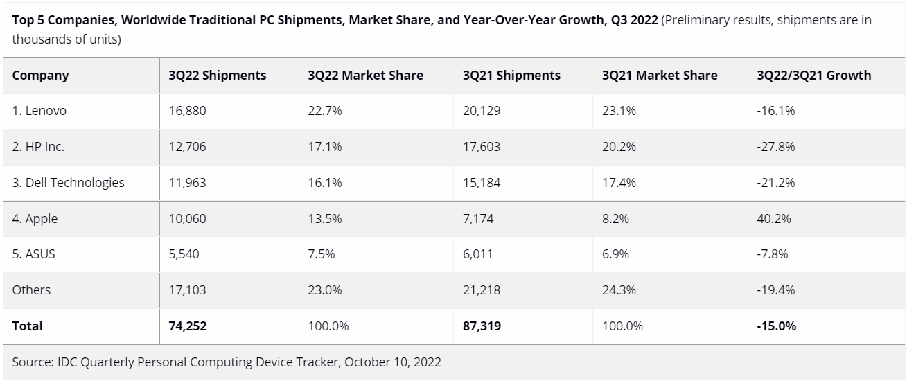 2022年Q3全球PC市场出货量统计,图源:IDC