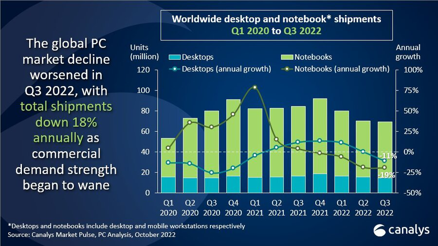 2022年Q3全球PC市场出货量统计,图源:Canalys