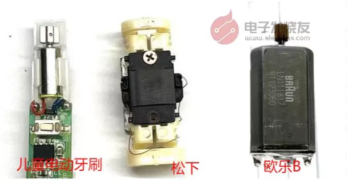 在电动牙刷中的应用中,电机的震动频率、摆幅、扭力与清洁能力相挂钩。上图分别是这三款电动牙刷所使用的电机,从体积来看,儿童电动牙刷的电机最小,甚至用来为其供电的7号电池都比他大一圈。