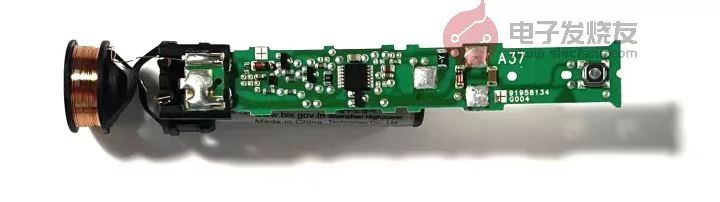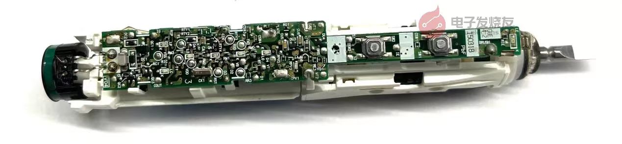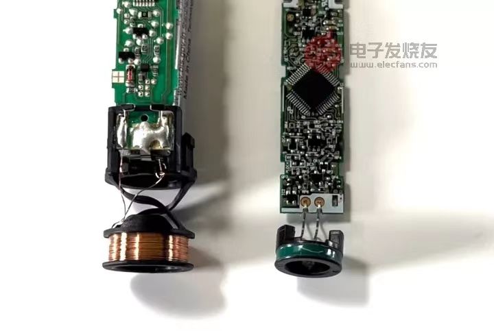 先从PCB板来看,在这三款电动牙刷中,儿童电动牙刷的电路是最简单的,PCB的长度只有2.3厘米,包括开关按键在内,一共就使用了6颗元器件。欧乐B电动牙刷的PCB虽然看起来很大,但是板子的利用率并不高,和儿童电动牙刷一样,看起来非常的精简,也许是因为这两款电动牙刷的工作模式单一,并不需要太多的外围电路作为支持,同时还能节省BOM成本。