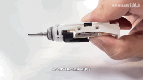电机的顶部是一个线圈,下面是两根并行的长条形磁铁,当磁悬浮电机通电后,线圈会产生一个磁场,在永磁体的作用下会悬浮起来, 此时MCU会通过预设的程序控制电机驱动MOS管的开关来改变电机的运动轨迹,使其发生高频的前后伸缩形变,这一高频的形变会通过这个黑色的塑料块传递到与刷头的传动轴上,带动刷头的高频震动。
