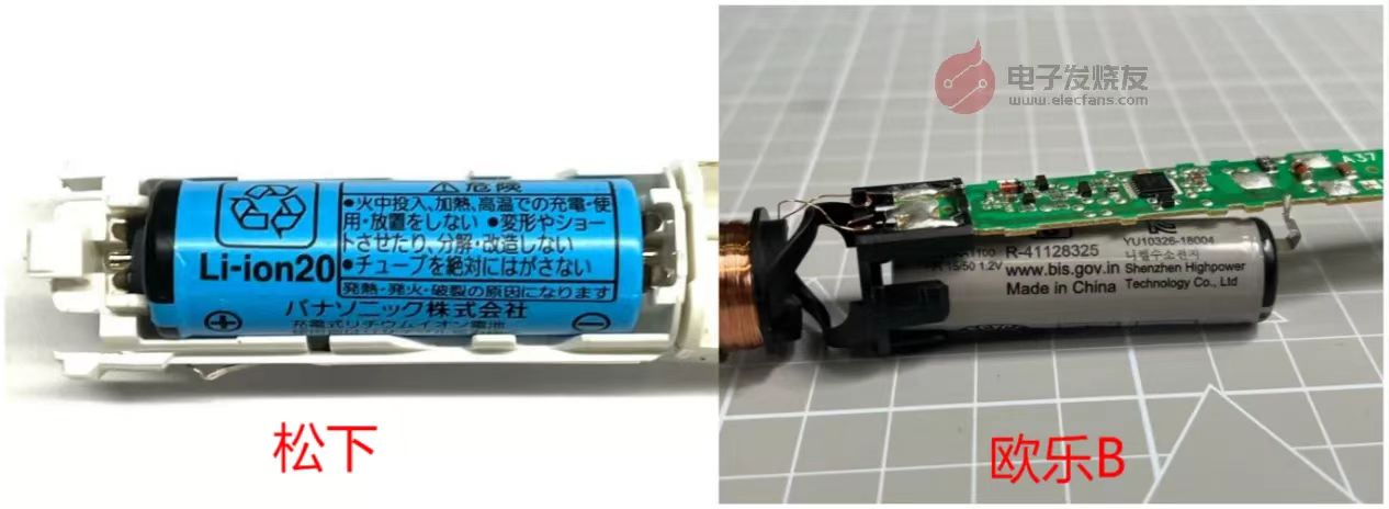 从电池信息来看,松下电动牙刷使用的是锂电池,虽然具体的电池容量并未标注,但亲测使用半个月以上,续航完全没有问题。欧乐B电动车使用的是一颗来自深圳豪鹏科技的镍氢电池,工作电压只有1.2V。