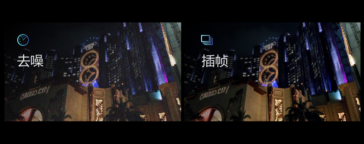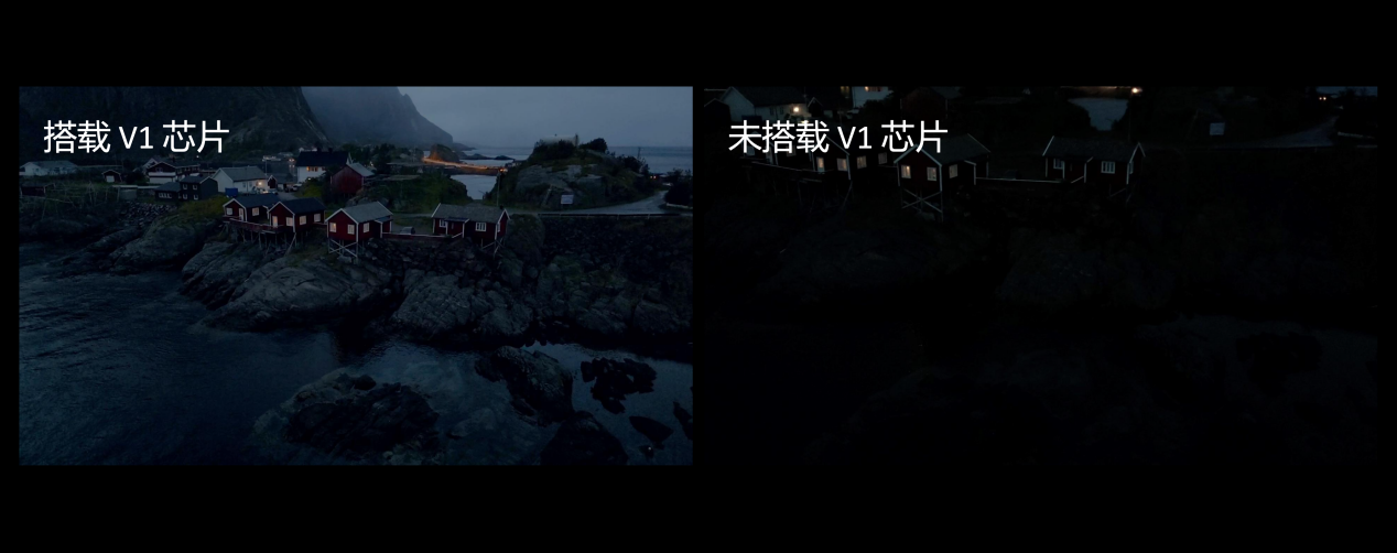 比如夜景视频的拍摄,通过V1进行降噪和插帧,可以用计算量大的算法模块,即MEMC技术进行运动补偿,在V1协助下主芯片在低光录像时以低功耗运行全高清60帧的MEMC去噪和插帧,提升了夜景影像效果。并且配合主芯片的降噪功能,进行二次提亮二次降噪。