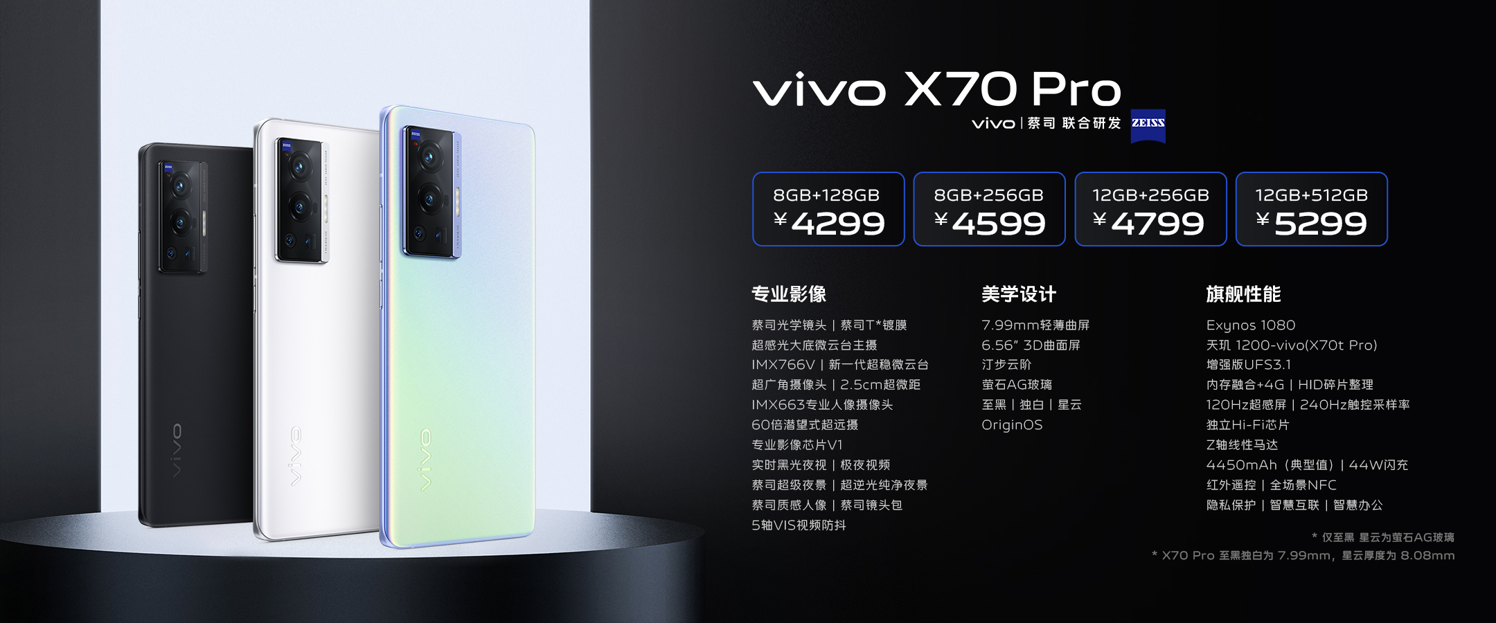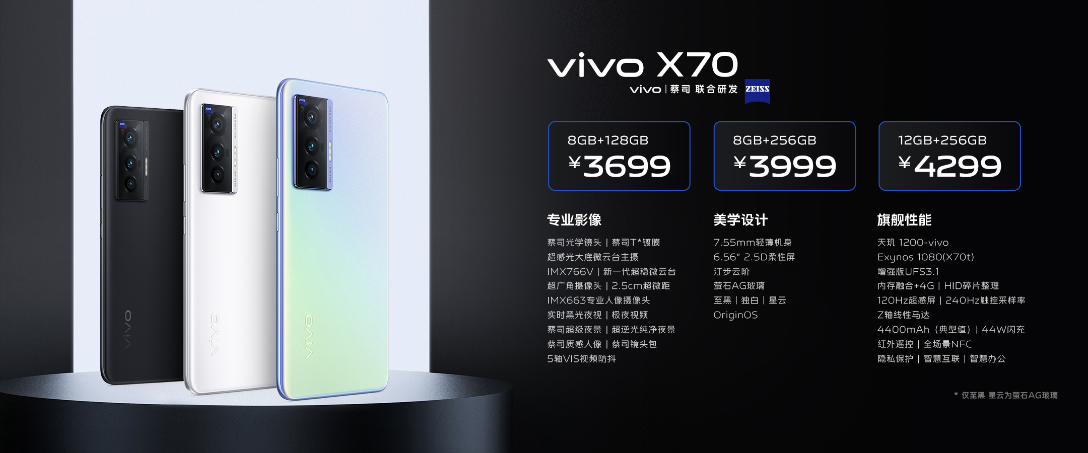 vivo X70系列售价在发布会中公布,vivo X70 Pro 8GB+128G版、8GB+256GB版、12GB+256GB版和12GB+512GB版本价格分别为4299元、4599元、4799元以及5299元;vivo X70 Pro+ 8GB+256GB版、12GB+256GB版和12GB+512GB版本售价分别为5499元、5999元以及6999元;vivo X70售价3699元起。