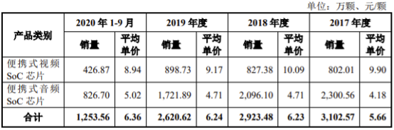 报告期内,便携式音视频 SoC 芯片系列产品销量分别为 3,102.57 万颗、2,923.48 万颗、2,620.62 万颗及 1,253.56 万颗,终端品牌客户有纽曼、飞利浦、爱国者、创维等。随着产品技术的成熟以及市场竞争力的提高,该系列产品平均单价不断上升,销售收入占主营业务占比接近一半。