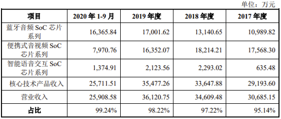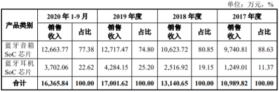 招股书显示,2017 年至 2020 年1-9月,炬芯科技营业收入分别为30685.15万元、34609.48万元、36120.75万元、25908.58万元。