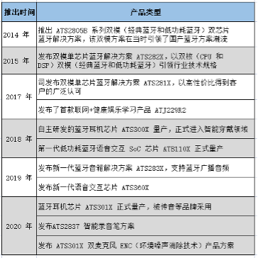 炬芯科技的产品研发围绕音频领域展开。近年来,智能穿戴市场中TWS耳机迎来较大的发展前景,炬芯科技持续发布新技术和新产品。主要产品为蓝牙音频 SoC 芯片系列、便携式音视频 SoC 芯片系列、智能语音交互 SoC 芯片系列,占营收的95%以上。
