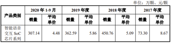 智能语音交互 SoC 芯片系列产品是炬芯科技的新产品线,通过低功耗、高性价比来满足智能家居等不同的应用场景。由于终端市场需求的变化,该系列产品平均价格以及销量波动较大,报告期内最高销量是在2018年,450.76万颗,收入达2,293.02万元