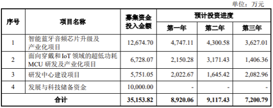 另外,炬芯科技在招股书中提到募集资金投资项目实施风险。炬芯科技拟募资3.52亿元,用于智能蓝牙音频芯片升级及产业化项目、面向穿戴和