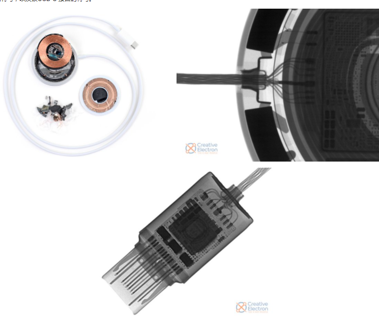 进一步拆卸可能不会产生太多,但这就是X射线的用途。这是电缆连接点处的应力消除的特写,以及该USB-C 接口的特写。