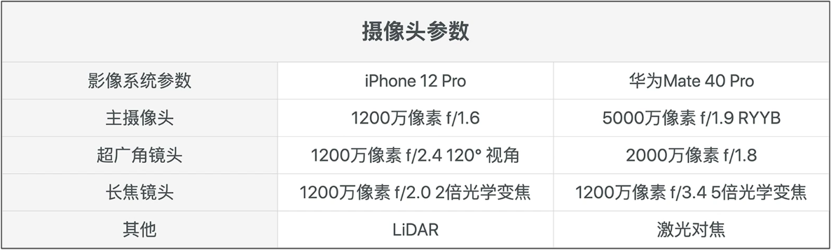 这一环节iPhone 12 Pro和Mate 40 Pro的相机参数我们不一一列举了,感兴趣的可以看这个表格。