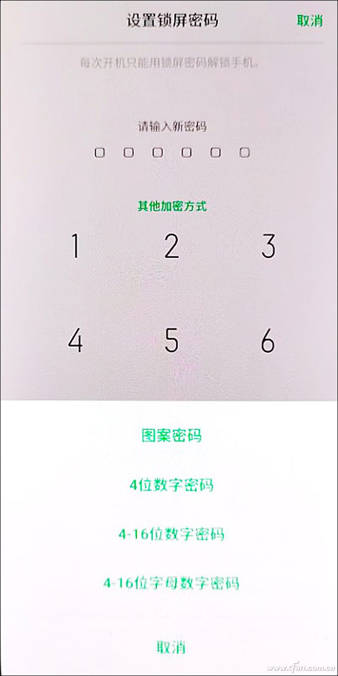 默认的锁屏密码是6位数字,而我们可以通过点击界面上“其他加密方式”选择图案密码、4位数字、4位~16位的纯数字或数字+字母组合密码。