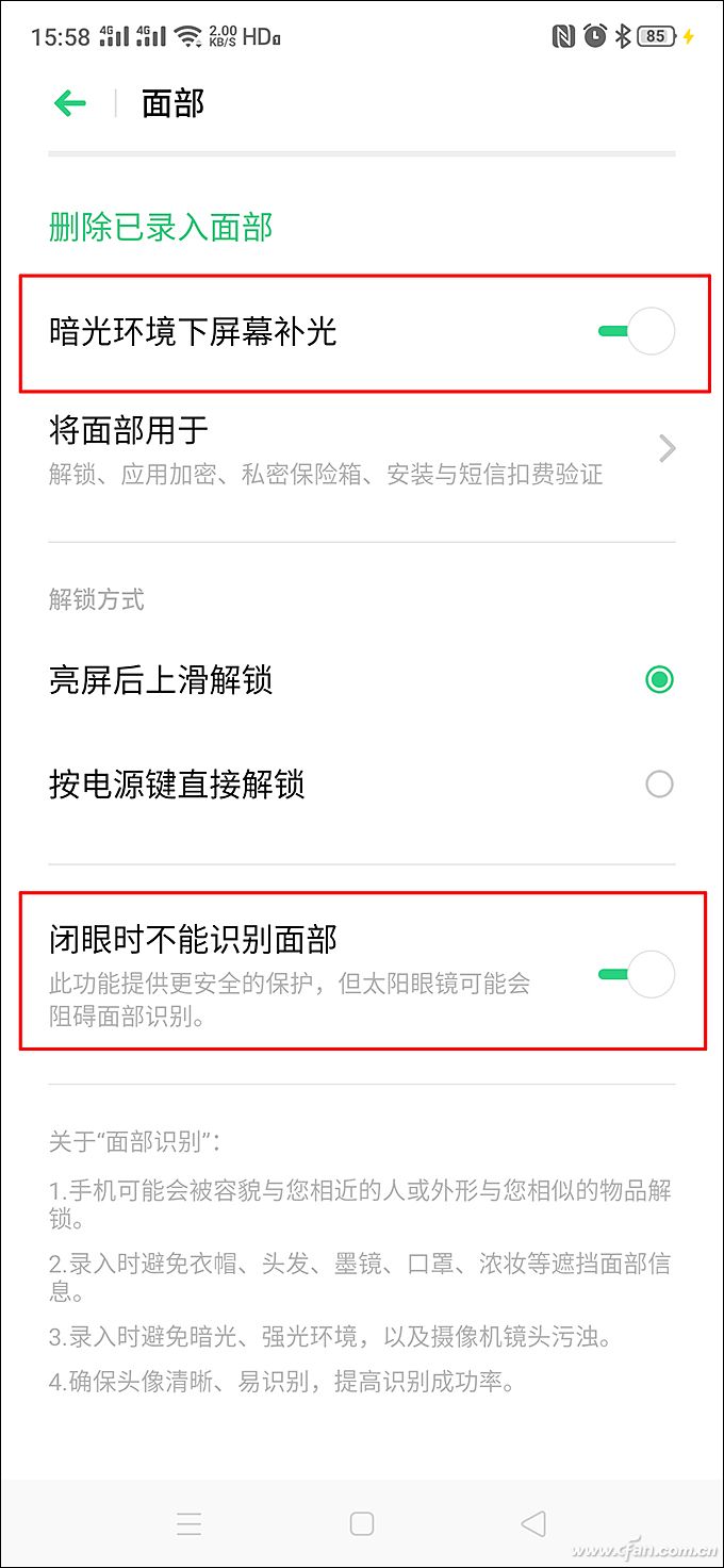 而为了提升面部识别的成功率和安全性,如果设置中有类似“屏幕补光”或“闭眼不能识别面部”一类的选项就请打开它们,前者可以提升暗光环境下解锁成功率,后者可以提供更安全的保护。