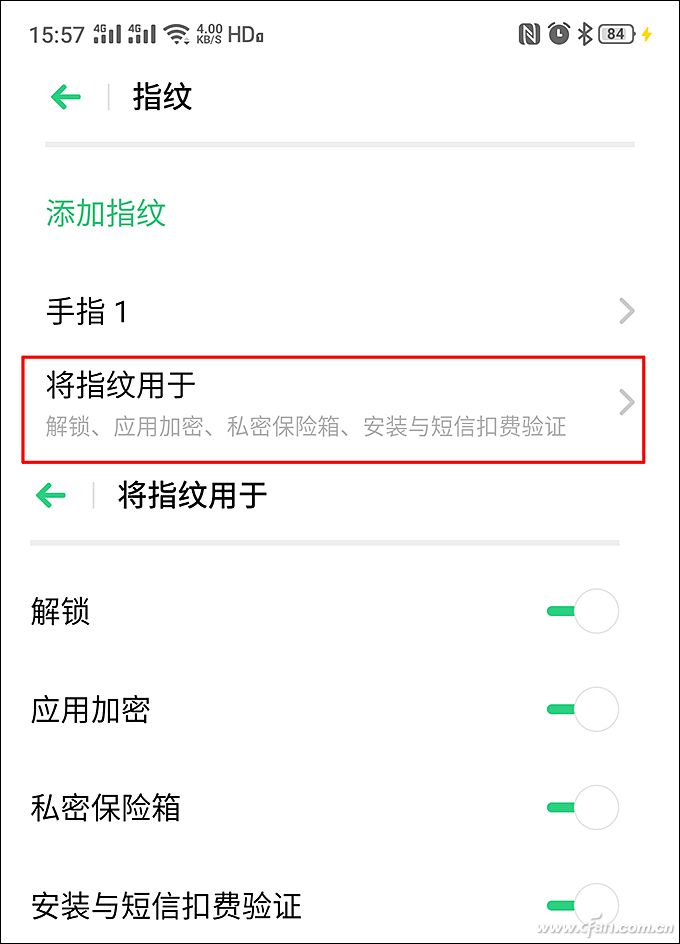 为了保护隐私数据,很多Android手机都提供了文件加密和应用加密一类的功能,在指纹和面部设置的界面中,我们可以将它们与当前的生物识别信息加以关联,以后打开加密的应用或文件时,按一下指纹或刷一下脸即可。