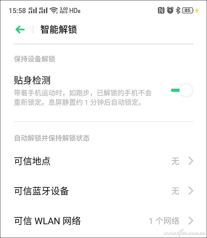 以OPPO手机为例,它在智能解锁中提供了贴身检测、可信地点、可信蓝牙设备和可信WLAN网络4种解锁方式。