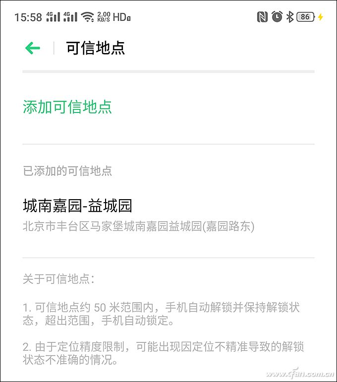 可以通过网络定位,将自己家、父母家添加到可信地点。只要手机检测到处于这些地点周边50米范围内就不会锁定。一般来说可以放心开启,手机在家总不会丢吧?当然,如果你担心被家人随意操作手机看到隐私,那就需要谨慎开启了。需要注意的是,在家附近遛弯时,如果手机不幸丢了,也可能会因处于可信位置而无法上锁。