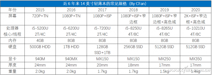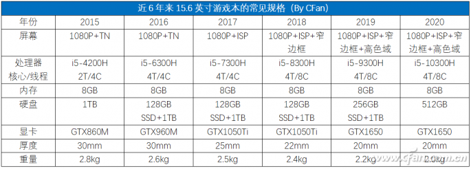 为了方便比对,小编罗列了2015年~2020年间,5000元~6000元价位的14英寸轻薄本和15.6英寸游戏本的常见规格,下文的很多观点都是建立在这些笔记本的比较之上。
