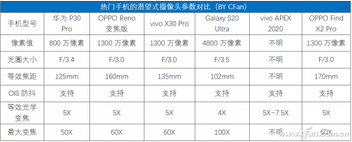 从去年底到上周,陆续上市的vivo X30 Pro、Galaxy S20 Ultra、vivo APEX 2020和OPPO Find X2 Pro也主打潜望式长焦镜头。问题来了,都是潜望式镜头,它们之间有啥差异?